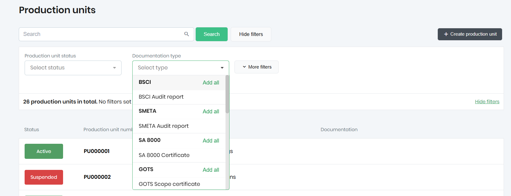 Để có cái nhìn tổng quan về tất cả các nhà cung cấp hoặc đơn vị sản xuất và trạng thái tài liệu của họ, cách dễ nhất là sử dụng chức năng lọc trên danh sách nhà cung cấp hoặc đơn vị sản xuất.